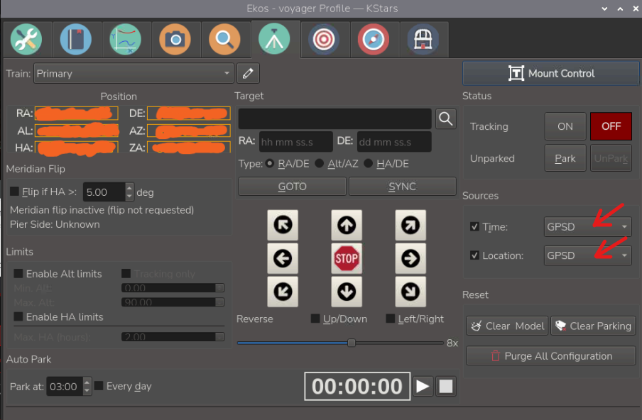 最後に、Ekos Profileの画面で、Mountのタブを選択し、SourceのTimeとLocationをGPSDにします。こうすることで、システム全体がGPSDの時間情報と、位置情報を使うようになります。